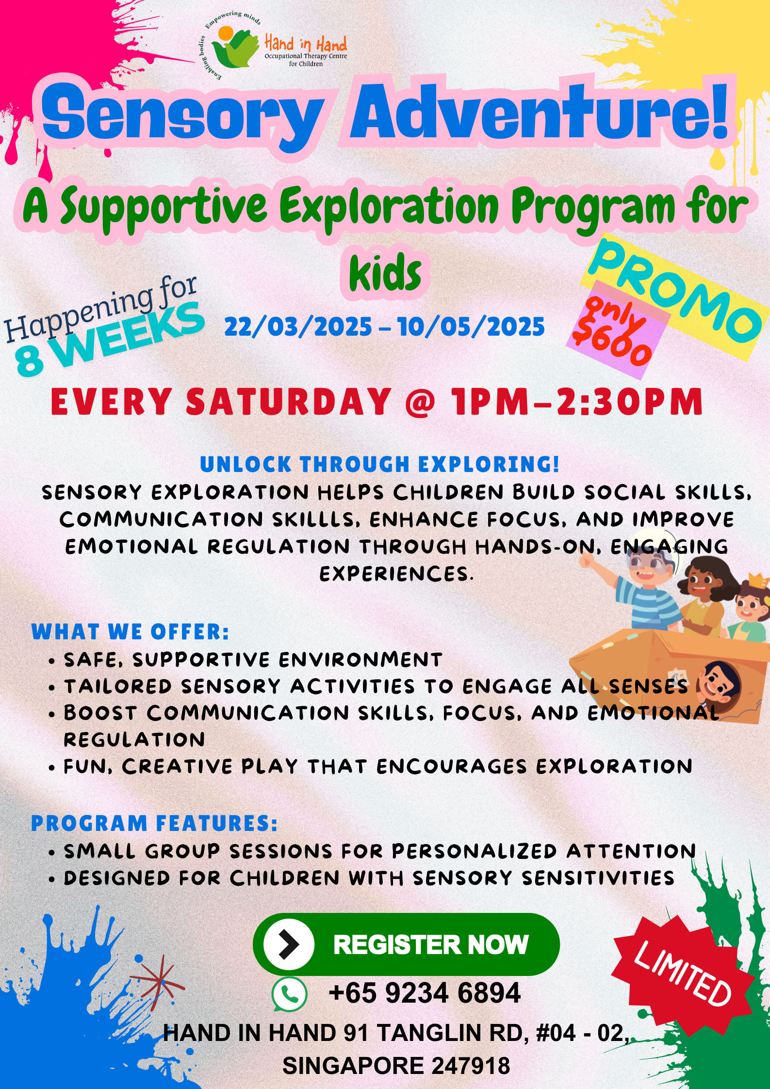 Engage with us on various sensory experiences to help develop and integrate different parts of the brain, building connections that are essential for oral-motor, speech and social development. Find out why!